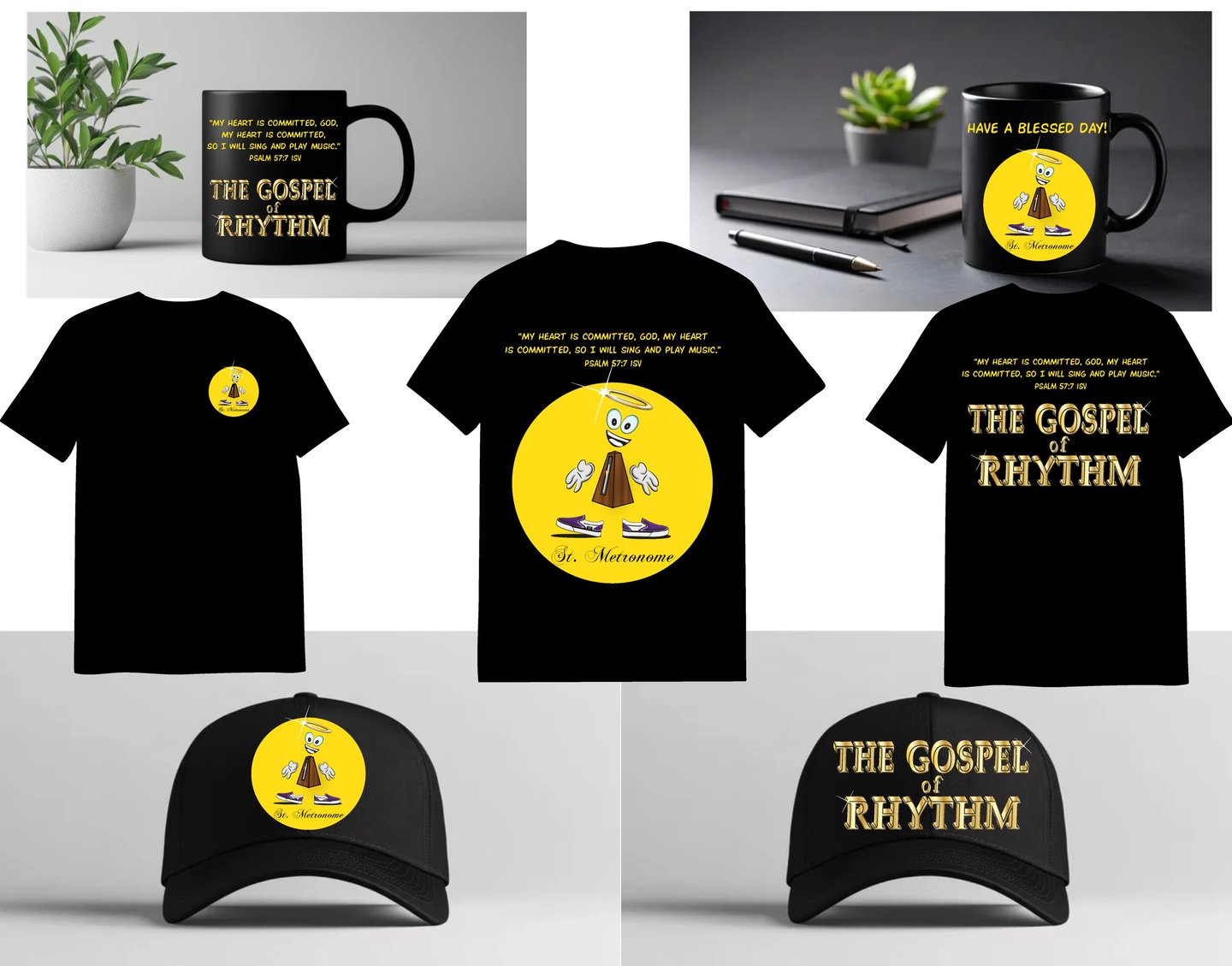 Now you can take St. Metronome with you wherever you go! Browse our exclusive line of St. Metronome merchandise — including T-shirts, stickers, mugs, tote bags, and more. Perfect for students, teachers, worship leaders, and music lovers, who want to celebrate their passion for rhythm and faith in a fun and creative way.